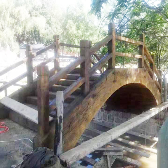 仿木桥色彩鲜亮、表面光洁、强度高、韧性强、耐腐蚀、抗紫外线、不退色、不开裂、不脆化的优点,成为具装饰效果的实用小品。仿木桥纹理细致逼真,经表面艺术处理强化了真实木材的纹理质感,提高了仿真的艺术观感,水泥仿木桥与自然高度和谐,环保耐久,克服了木材易腐蚀变形的缺点,极大限度保护了有限的森林资源,是现代景观艺术的上佳选择。